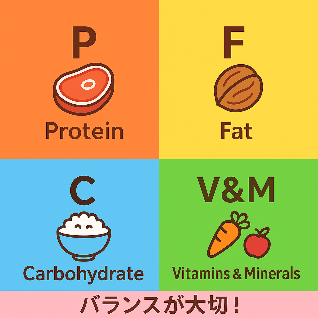 PFCバランス(タンパク質・脂質・炭水化物)に加え、ビタミン・ミネラルをしっかり摂ることが理想です。